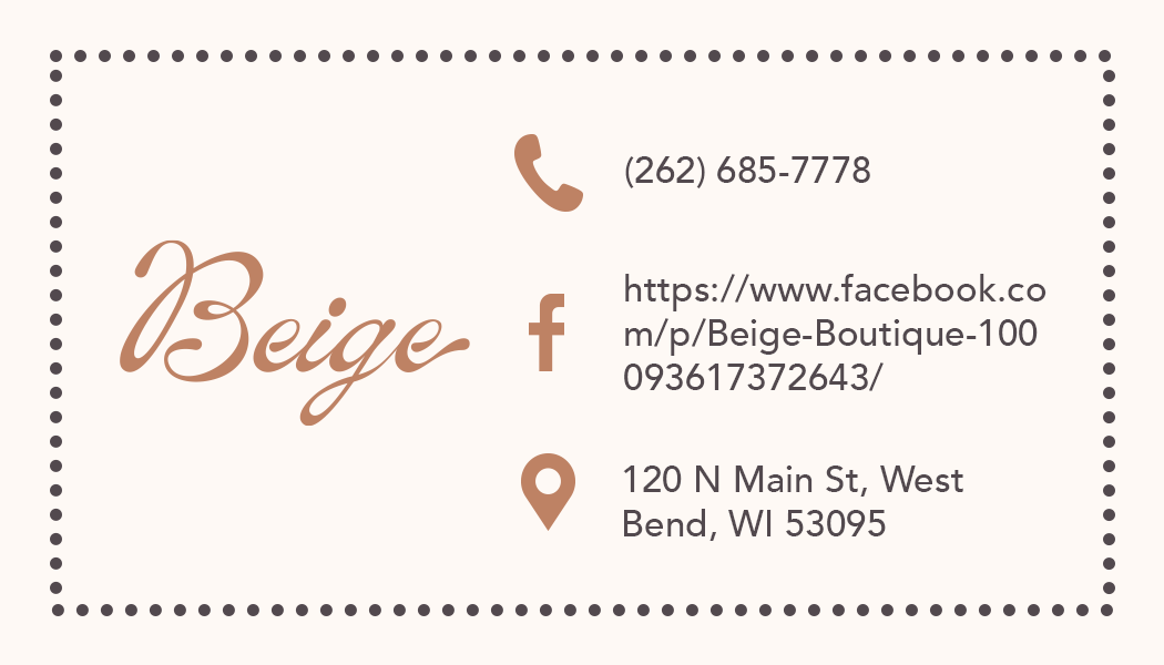 Beige Boutique has undergone a stunning and captivating rebrand. I designed three new logos that maintain a simple elegance while effectively showcasing the aesthetic and charm Beige Boutique aims to convey. For the color palette, I selected neutral shades, both light and dark, as they complement the products they offer and are perfect for encouraging women to celebrate their inner beauty. As part of this rebranding effort, I created a new business card, shopping bags, business sign, and tags for their boutique. Located in downtown West Bend, Beige Boutique’s rebrand is sure to catch your eye and invite you right in!