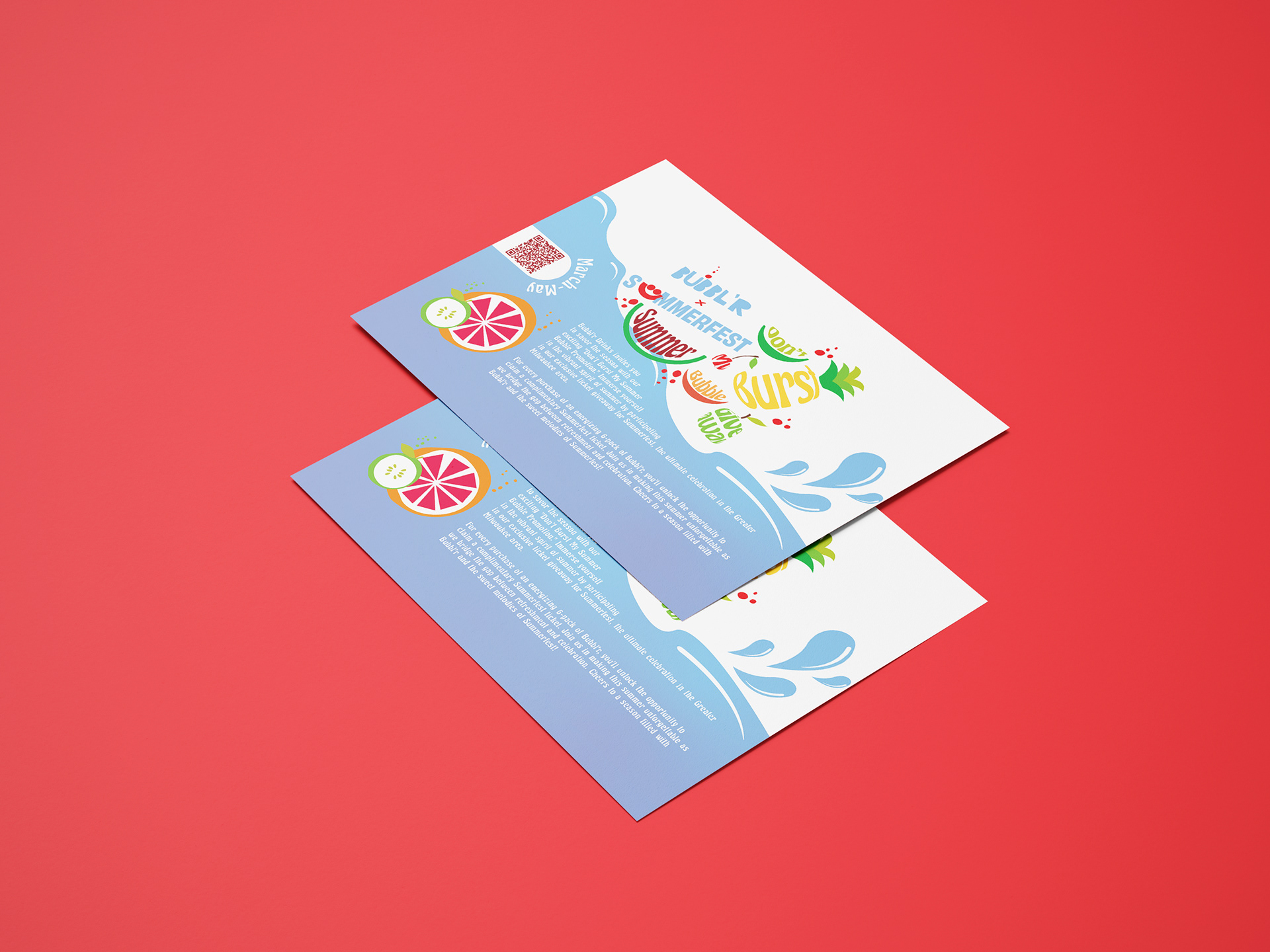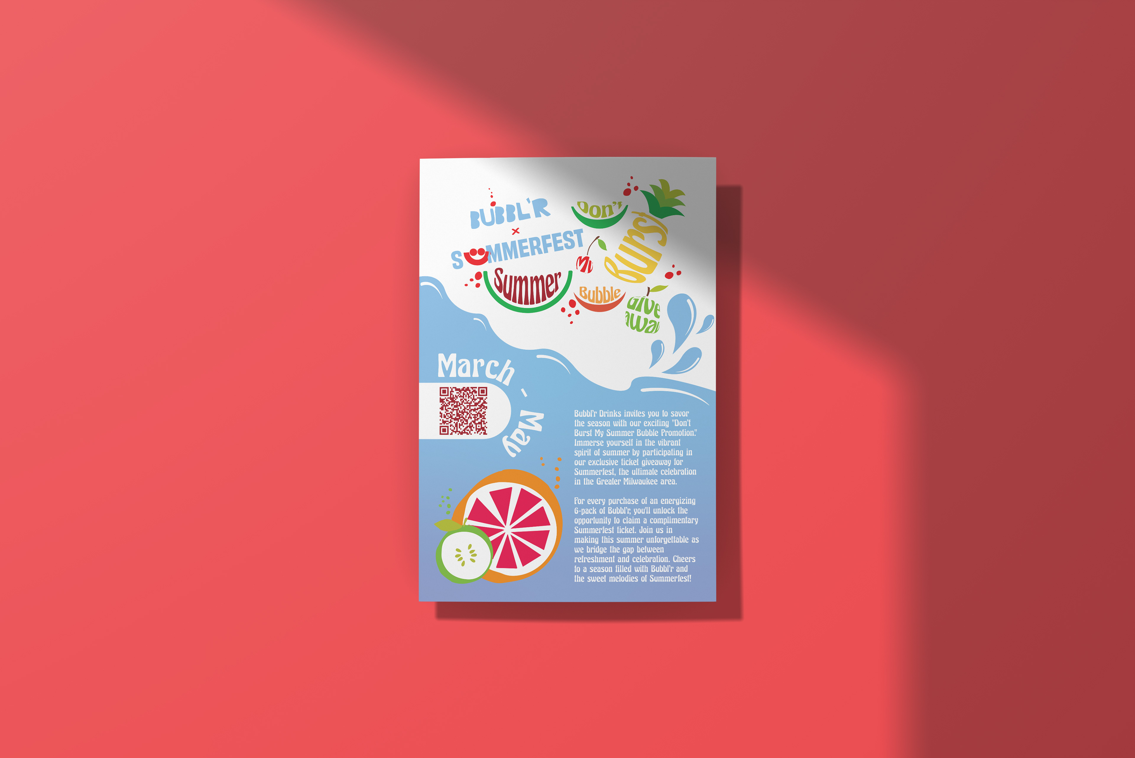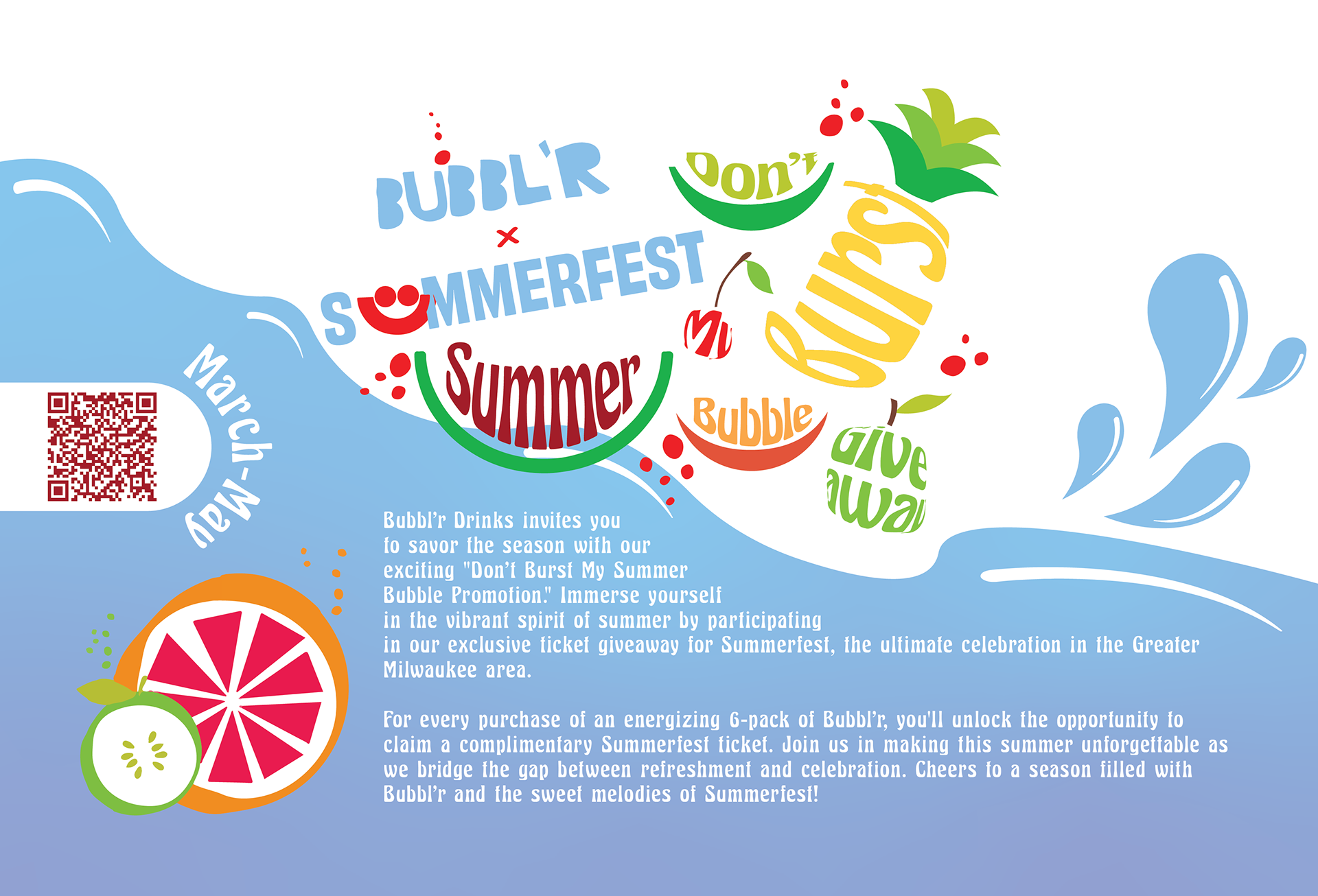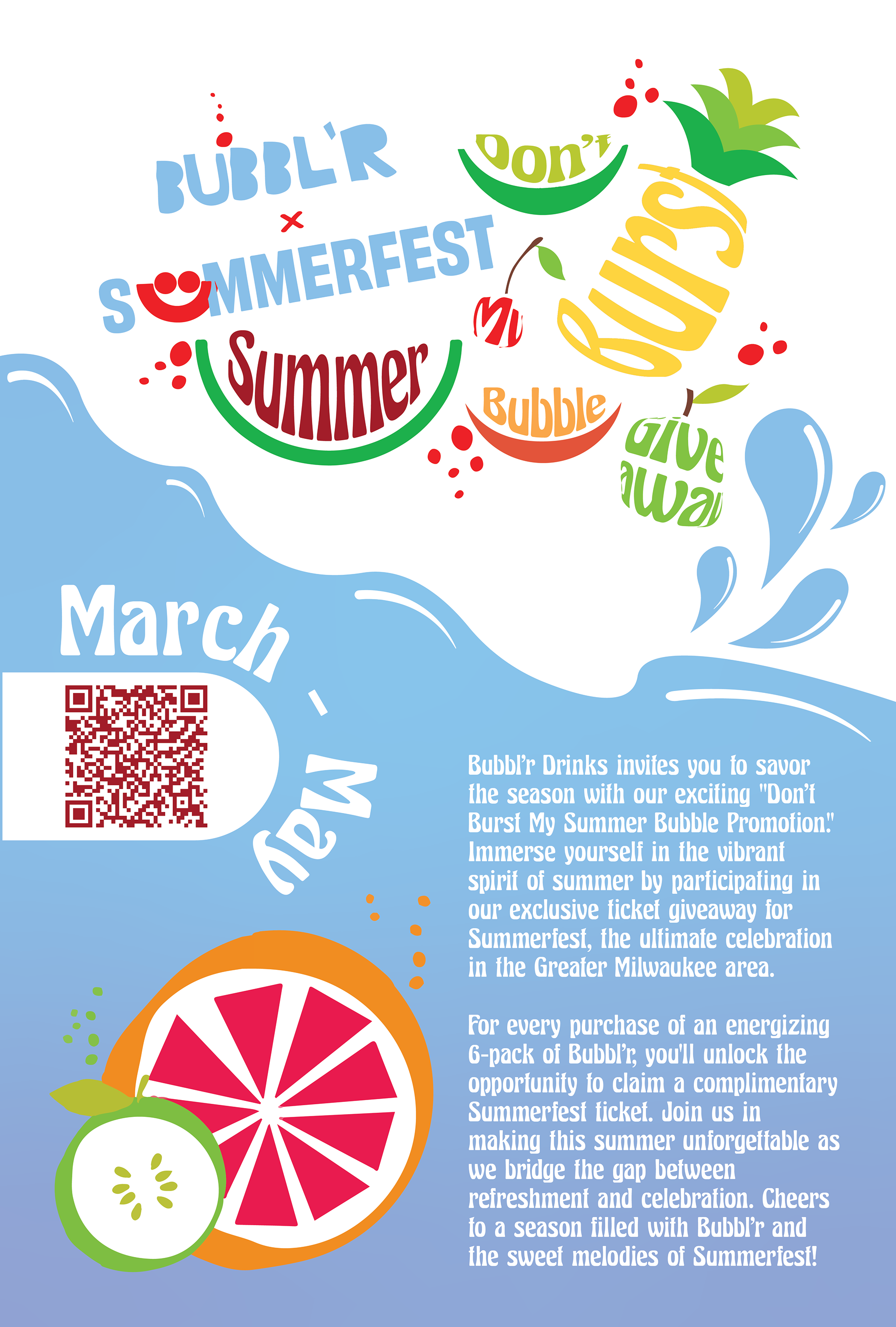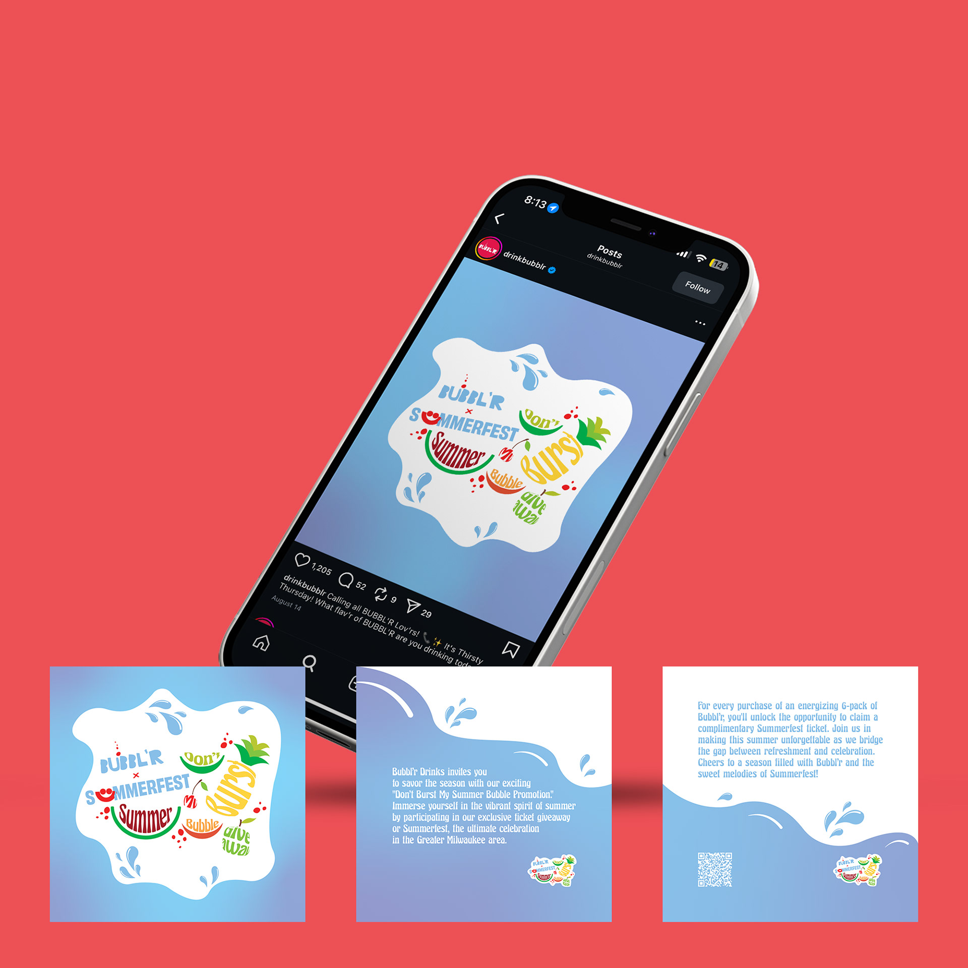 The Bubbl’r x Summerfest team-up felt as fresh and lively as their drinks. For this collaboration, I designed the logo, a poster, a flyer, and instagram ads to boost their giveaway. The logo aims to spotlight all the flavors Bubbl’r offers, while the designs highlight how refreshing they are. Bright colors and playful fonts used in these designs scream summer time fun!