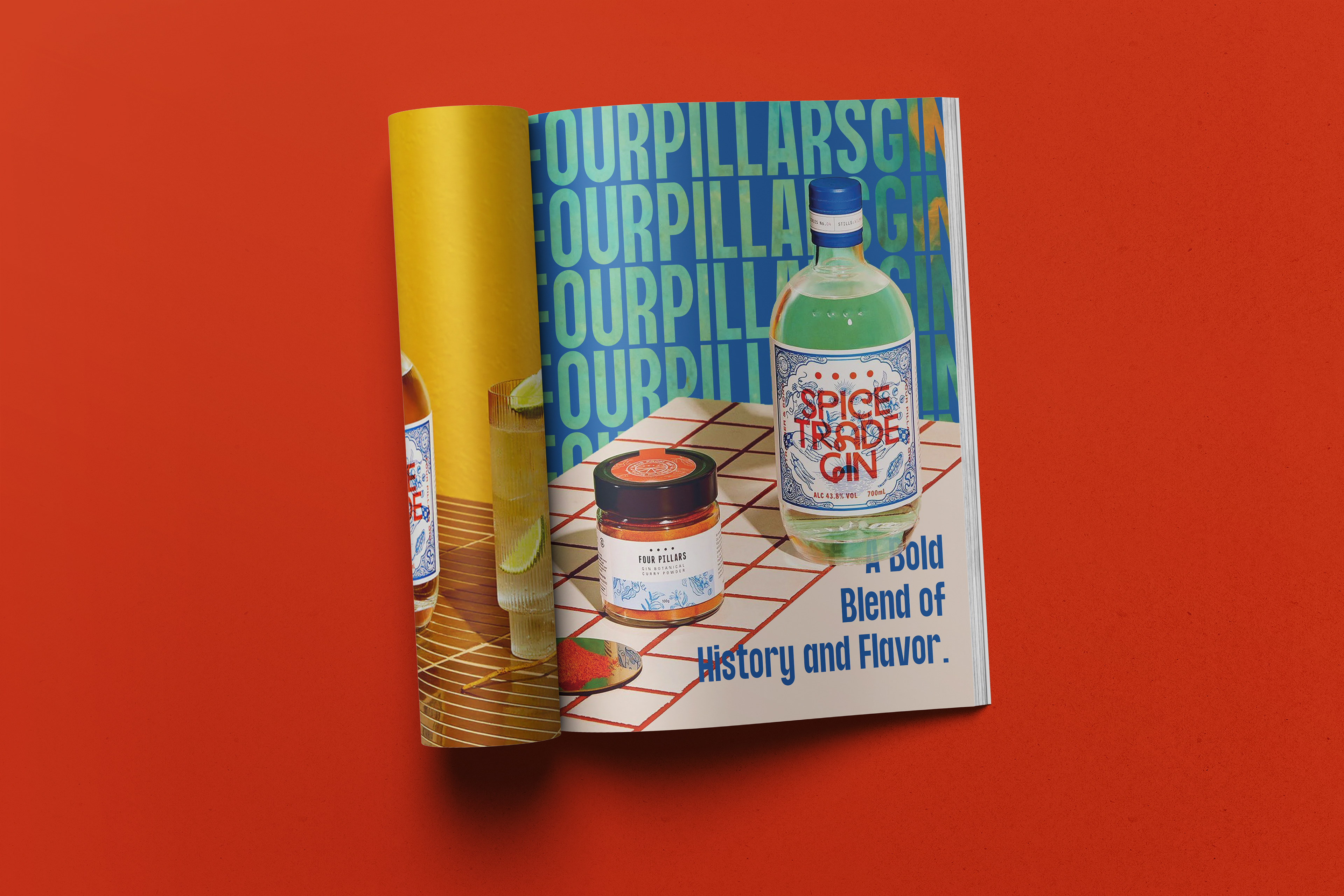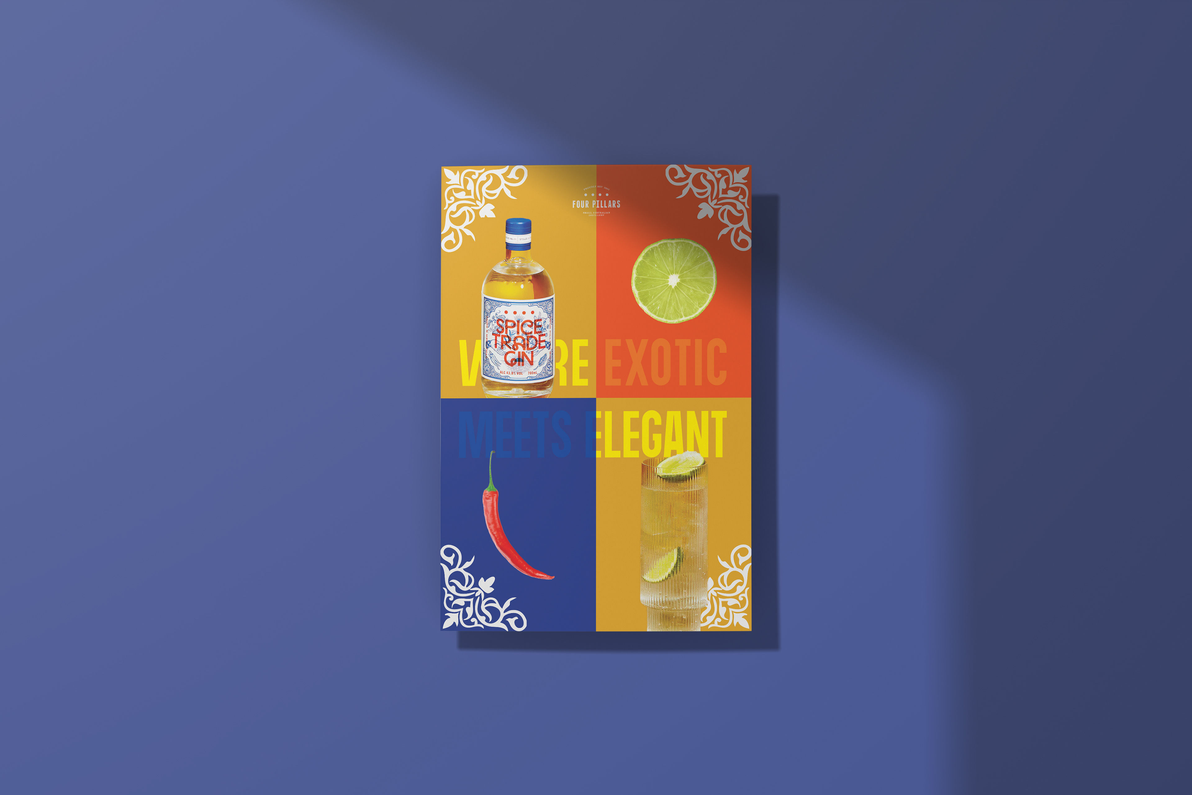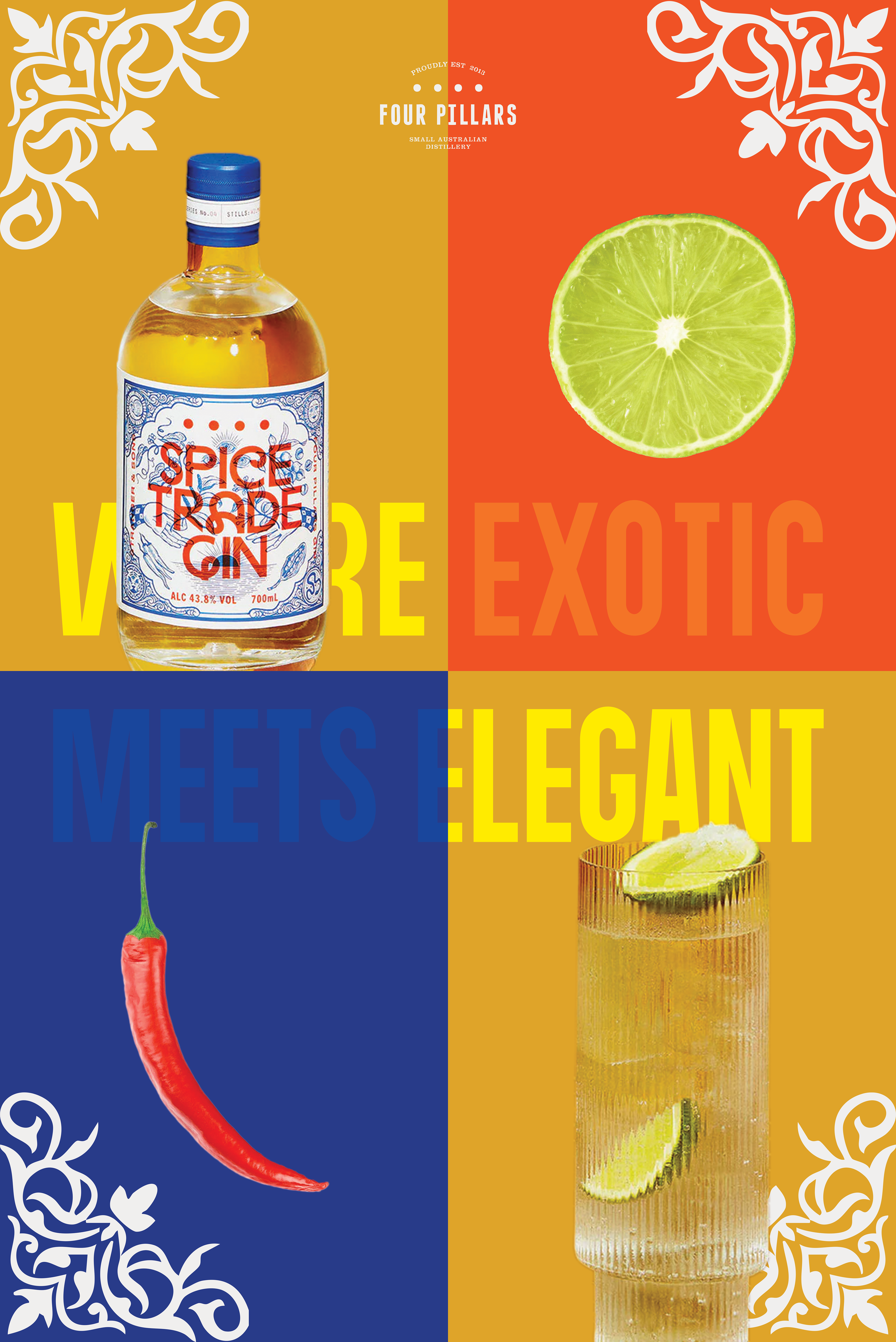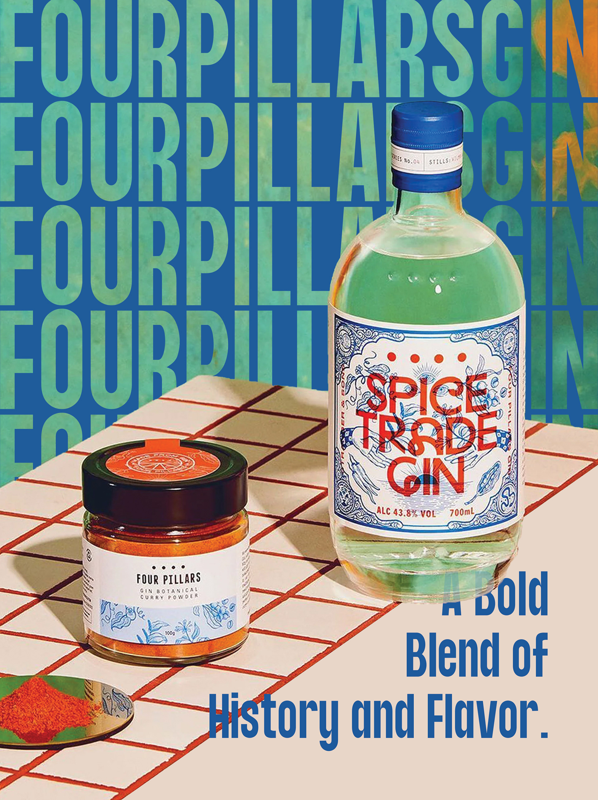 The ads for Four Pillars Gin; poster, web banner, and magazine ad, center on their Spice Trade Gin. These ads are supposed to feel as lively and flavorful as the gin itself. I chose bright colors and patterns that echo the spices and fruits in the gin, plus the history behind creating this gin.
